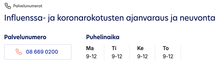 Puhelinajanvaraus aukeaa tiistaina 23.9. kello 9 ensin yli 80-vuotiaille ja voimakkaasti immuunipuutteisille. Soita Pohteen influenssa- ja koronarokotusten ajanvaraukseen ja jätä takaisinsoittopyyntö. Puhelinajanvaraus aukeaa: