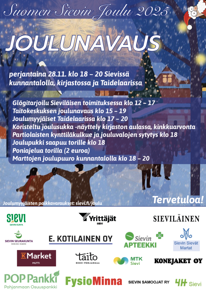 Joulumyyjäisten paikkavaraukset viestinta [at] sievi.fi (viestinta[at]sievi[dot]fi) tai p. 044 4883 206. Myyntipaikat on tarkoitettu kaikille sieviläisille tahoille - yhdistyksille, ryhmille, koululuokille, yrityksille, ja ne täytetään ilmoittautumisjärjestyksessä yksi (1) pöytä per taho. Myyjäisiin voi osallistua maksutta, mutta ennakkovaraus vaaditaan.