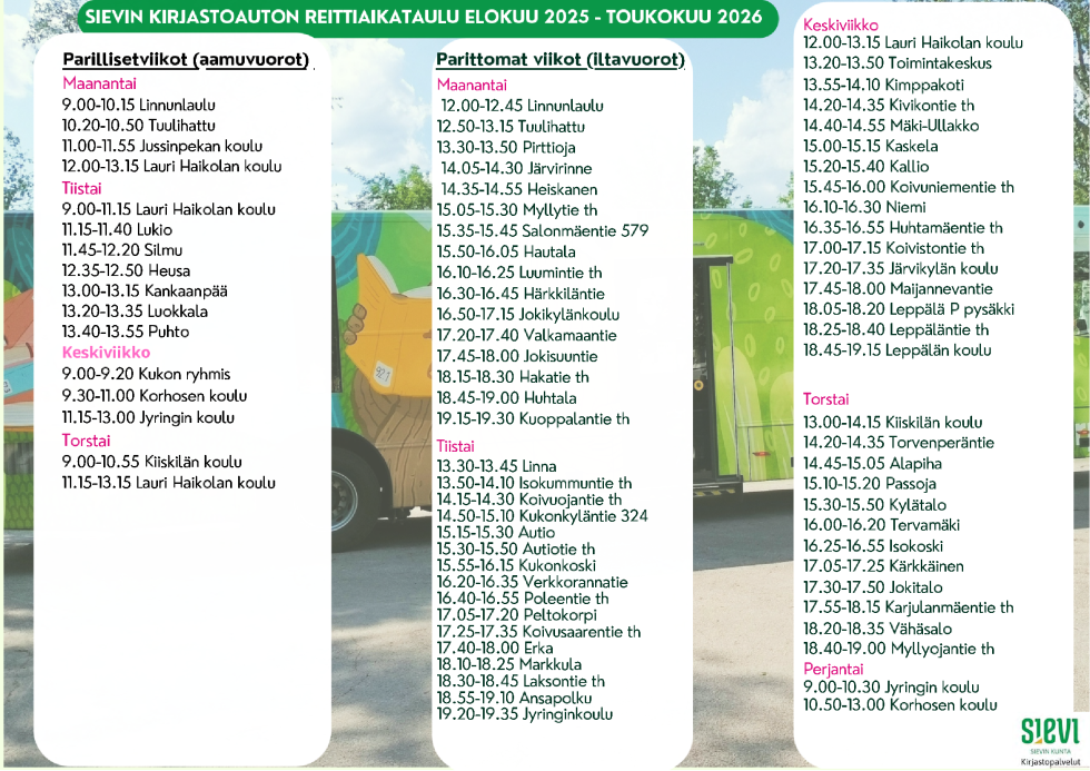 Kirjastoauto liikennöi koulupäivinä. Talvilomalla (vko 10) ja syyslomalla (vko 43) kirjastoauto ei liikennöi.