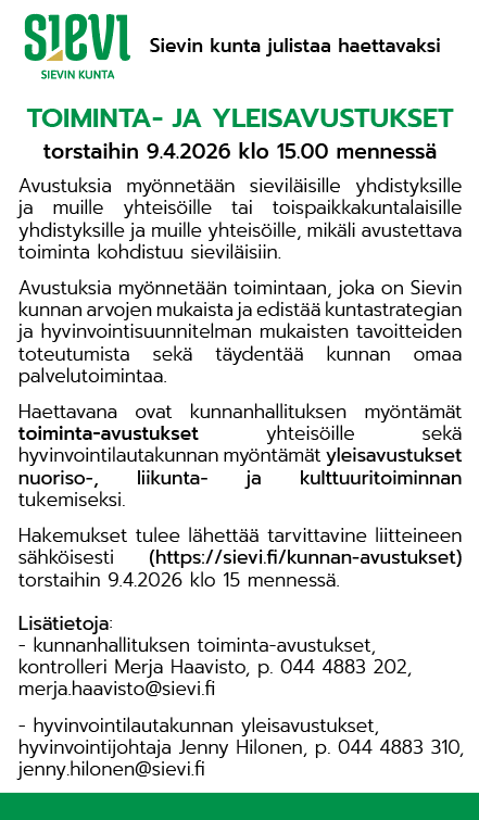 Toiminta-avustuksella tarkoitetaan harkinnanvaraista avustusta, jonka kunnanhallitus voi myöntää yleishyödyllisille yhdistyksille tai muille toimijoille. Toiminta-avustuksen tarkoituksena on tukea Sievissä järjestettävää monipuolista toimintaa ja edistää sieviläisten hyvinvointia. Avustuksia myönnetään toimintaan, joka on Sievin kunnan arvojen mukaista ja edistää kuntastrategian ja hyvinvointisuunnitelman mukaisten tavoitteiden toteutumista sekä täydentää kunnan omaa palvelutoimintaa. Kunnanhallitus voi linjata avustustoiminnan erityiset painopisteet.