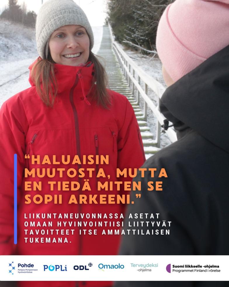 Muutosvoima-hankkeen aikana Sievin kunnan asukkailla on mahdollisuus saada maksutonta liikuntaneuvontaa. Palvelu sopii yli 18-vuotiaille, jotka kaipaavat tukea oman hyvinvoinnin edistämiseen. Palveluun ohjaudutaan täyttämällä Omaolo-terveystarkastus sähköisesti osoitteessa www.omaolo.fi/palvelut/terveystarkastus. Palveluun ohjautumisessa voi kysyä apua liikuntaneuvojalta: Sari Pekkala sari.pekkala [at] pohde.fi p. 040 318 7348.