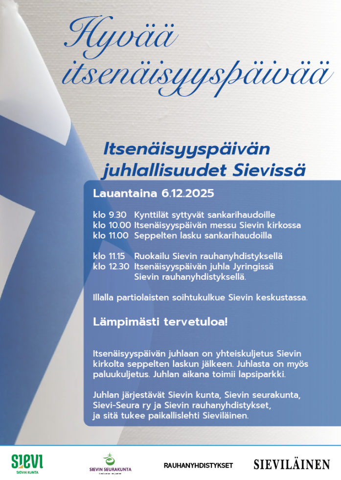 Itsenäisyyspäivän juhlaan on yhteiskuljetus Sievin kirkolta seppelten laskun jälkeen. Juhlasta on myös paluukuljetus. Juhlan aikana toimii lapsiparkki.