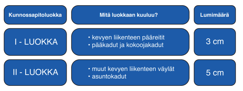 Urakoitsija laittaa kunnossapitokalustonsa liikkeelle, kun kunnossapitoluokan lumimäärä täyttyy: