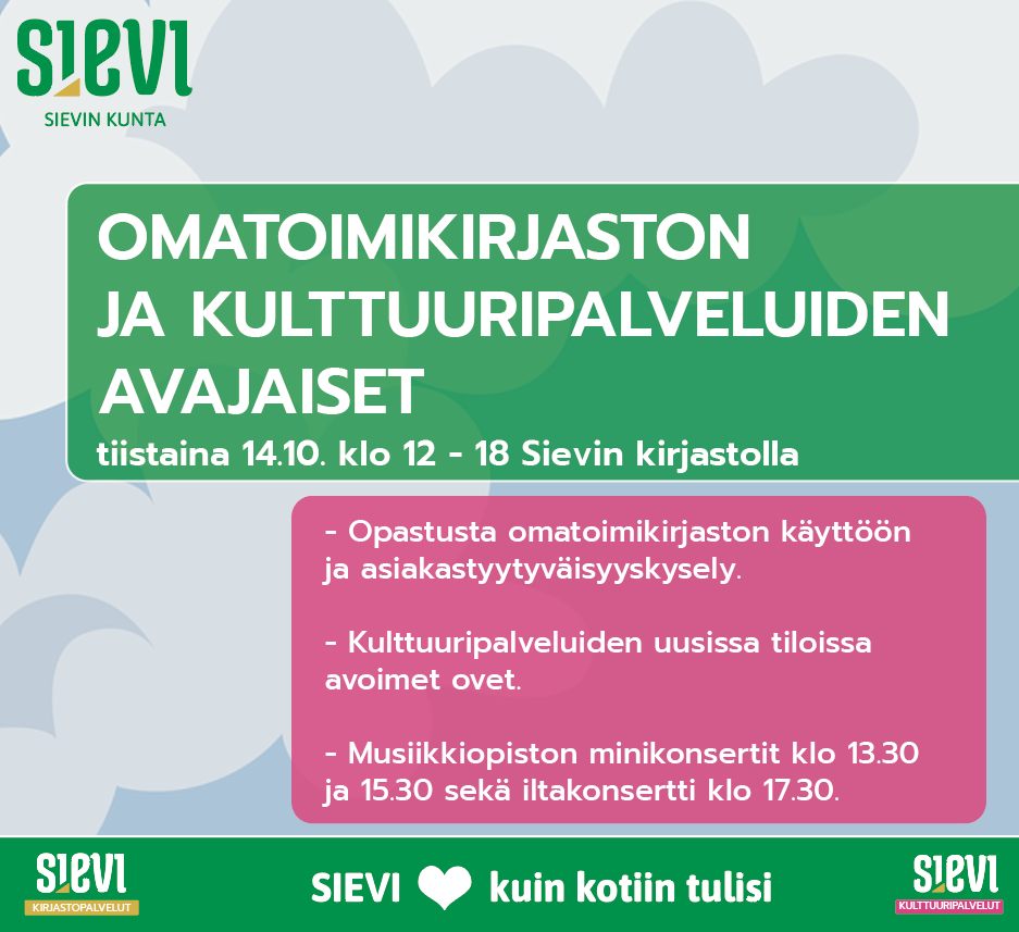 Päättäjä tavattavissa -tapahtuma sekä omatoimikirjaston ja kulttuuripalveluiden toimiston avajaiset tiistaina 14.10. klo 12 - 18 Sievin kirjastolla, tervetuloa! Kahvia ja pullaa!
