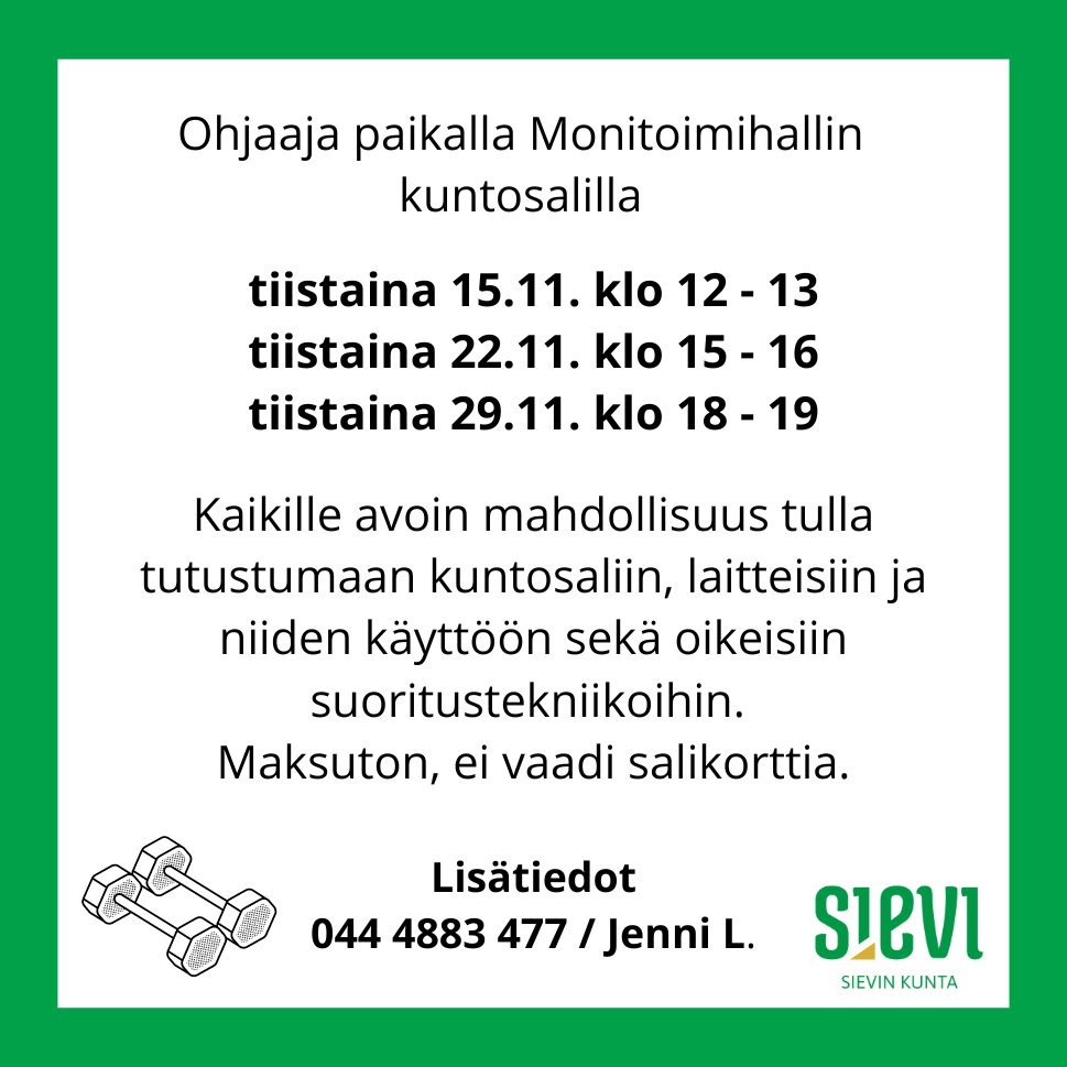 Ohjaaja paikalla Monitoimihallin kuntosalilla tiistaina 15.11. klo 12-13, tiistaina 22.11. klo 15-16 ja tiistaina 29.11. klo 18-19. Mahdollisuus tulla tutustumaan kuntosaliin, laitteisiin ja niiden käyttöön sekä oikeisiin suoritustekniikoihin. Maksuton, ei vaadi salikorttia.