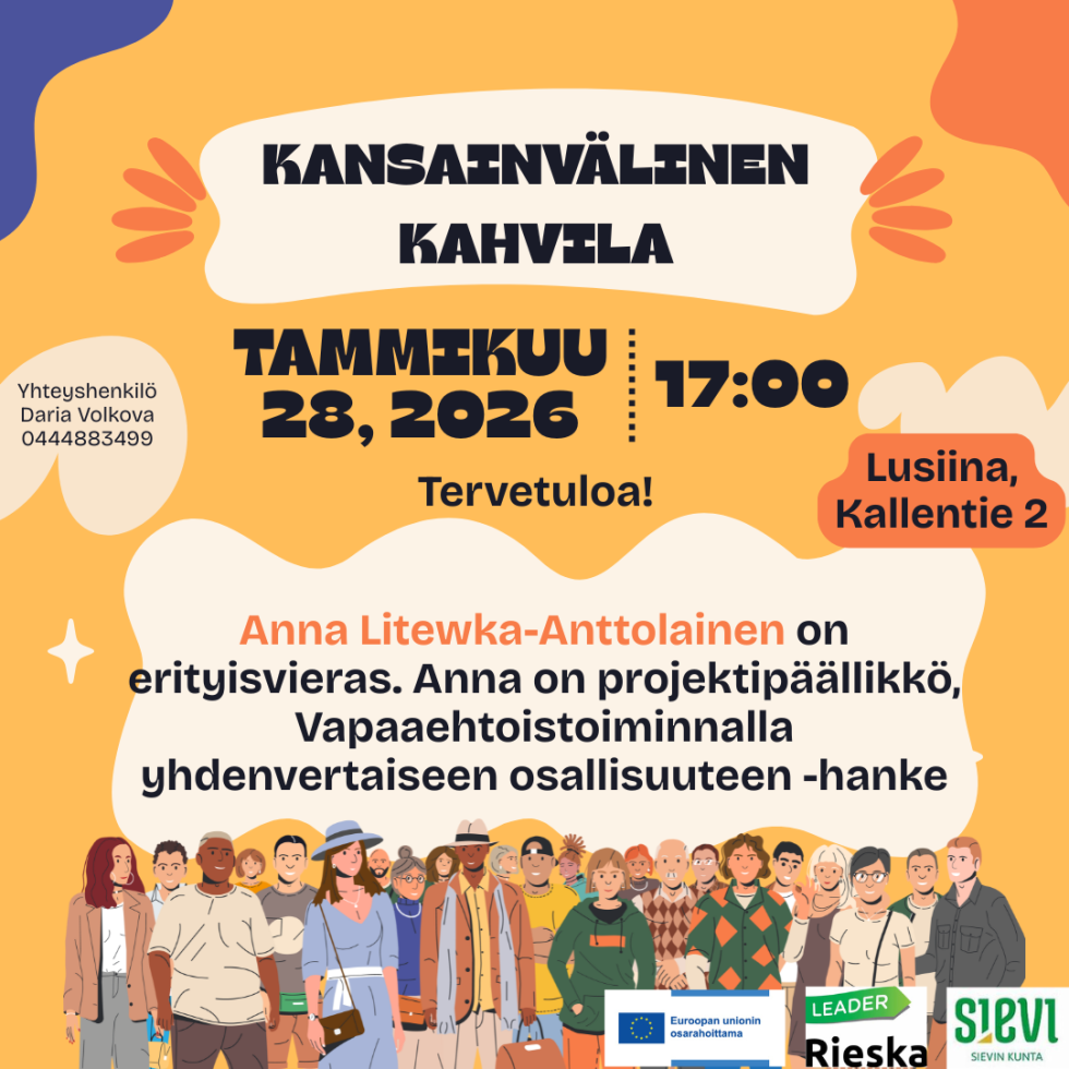 Sievin kv-kahvilat nyt myös Sievin keskustassa. Tervetuloa ke 28.1. klo 17 Lusiinaan kahvittelemaan yhdessä. Erityisvieraana projektipäällikkö Anna Litewka-Anttolainen Vapaaehtoistoiminnalla yhdenvertaiseen osallisuuteen hankkeesta.