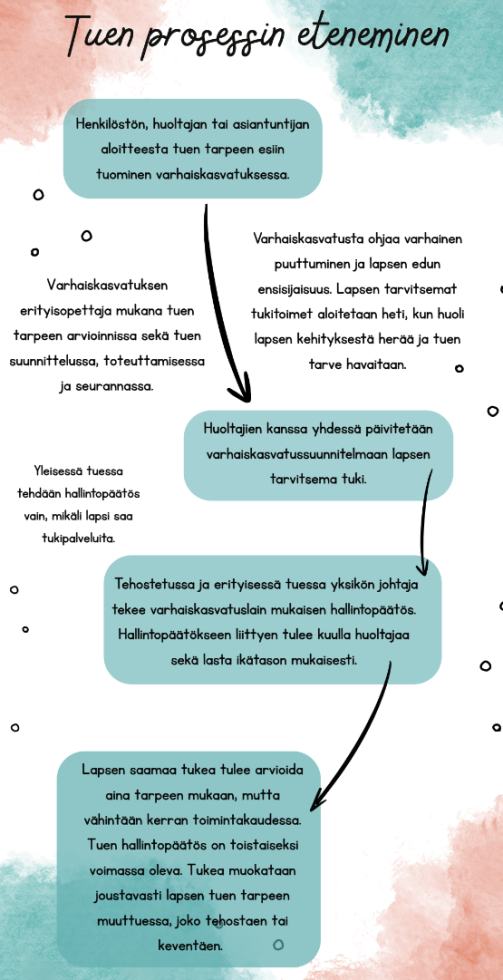 Varhaiskasvatukseen osallistuvalla lapsella on oikeus saada yleistä, tehostettua tai erityistä tukea siten kuin varhaiskasvatuslaissa on säädetty. Lapsen kehityksen ja oppimisen tuki on osa varhaiskasvatuksen päivittäistä toimintaa. Tuki järjestetään yksilöllisesti, joustavin järjestelyin lapsen vahvuuksien ja tarpeiden pohjalta.