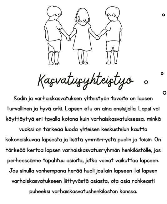 Varhaiskasvatuksessa lapsesi kasvaa, kehittyy ja oppii turvallisessa ja suunnitelmallisessa ympäristössä. Jokaista lasta tuetaan varhaiskasvatuksessa yksilöllisesti yhteistyössä lapsen huoltajien kanssa.